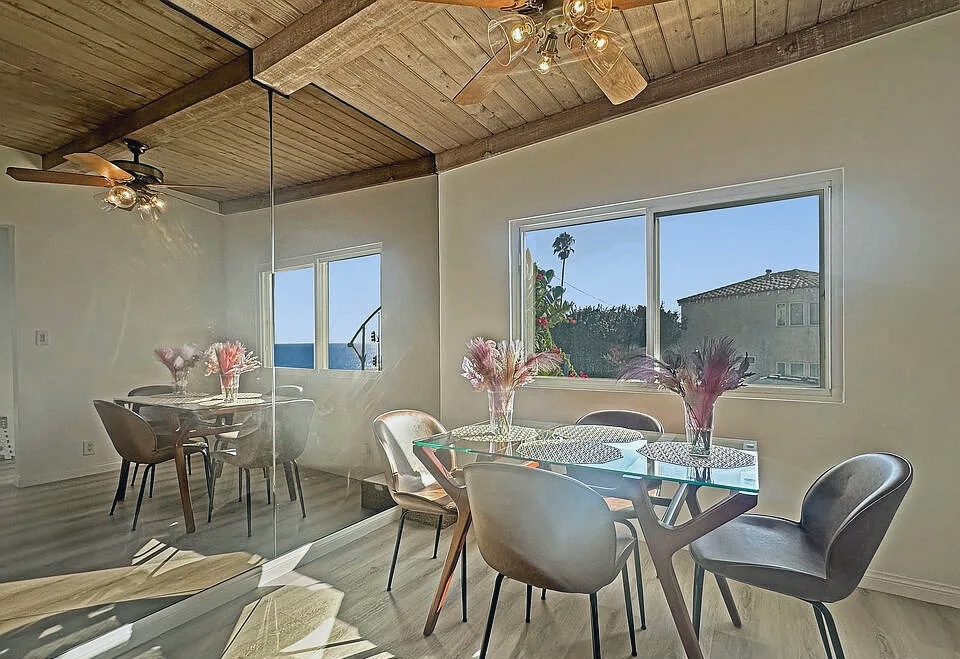 This furnished two-bedroom, two-bath beach house offers stunning ocean views and the perfect California coastal lifestyle just steps from the sand. The sun-filled open floor plan features high wood beam ceilings, large windows, a rock fireplace, and plank flooring throughout. The kitchen includes stainless steel appliances, built-ins, and a breakfast bar with ocean views, while the mirrored dining room reflects the surrounding coastal scenery. Both bedrooms open onto a lush backyard with mature trees and a grassy lawn, creating a serene retreat. Complete with an attached garage, washer/dryer, and a prime location near Marina del Rey and Manhattan Beach, this home combines mid-century charm with relaxed beachside living.